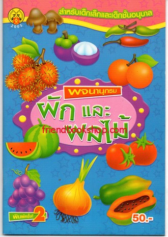 เป็นหนังสือพจนานุกรมประกอบไปด้วยคำศัพท์ภาษาอังกฤษ คำอ่านภาษาไทย คำแปล พร้อมรูปภาพสี่สีที่สวยงาม เกี่ยวกับผักเเละผลไม้ สำหรับเด็กๆ ในชั้นอนุบาล